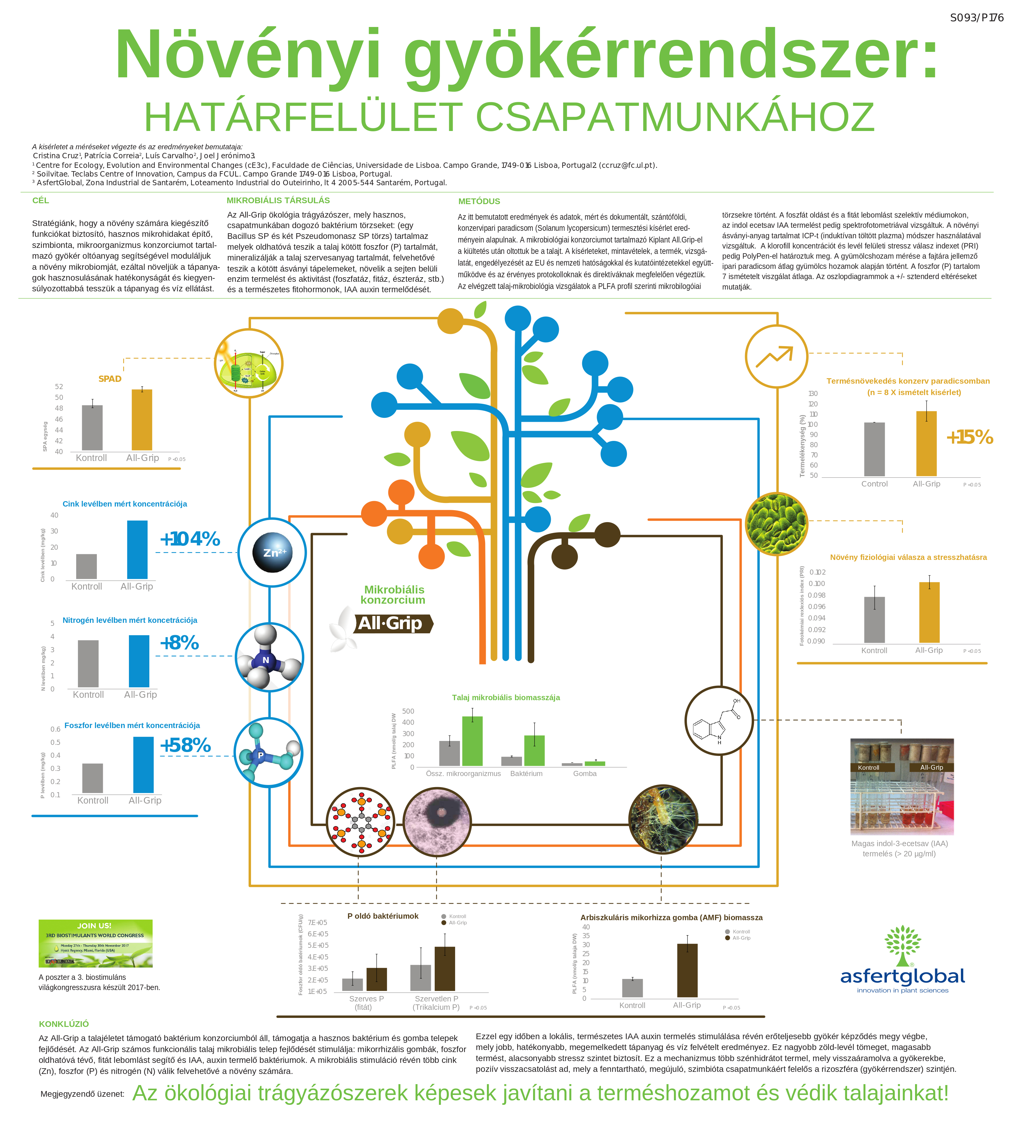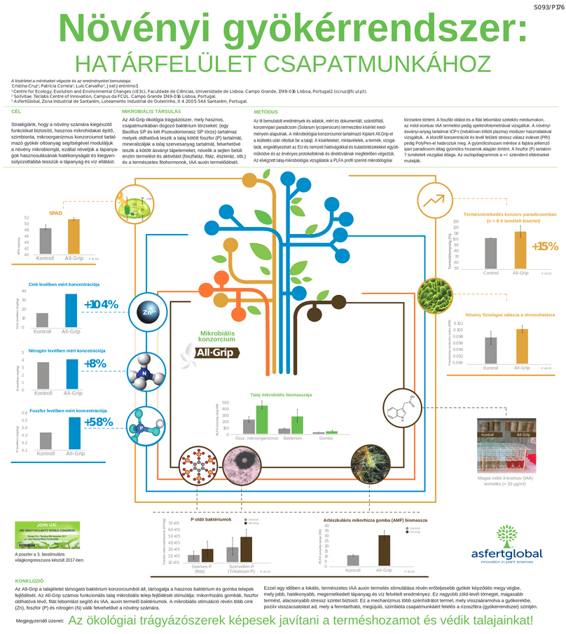 A talajvizsgálatok is jól mutatják, hogy a KIPLANT AWAKEN növeli a talaj-összetételének és szerkezetének minőségét. A hasznos gombák száma kiszorítja a talajból a káros, patogén gombákat, közvetlenül csökkentve azok számát. Továbbá a nitrogénkötő baktériumok száma is optimális, illetve növekvő tendenciát mutat, így a vegetatív, zöld növényi részek fejlődésében is jelentős szerepet játszik. Tehát több gyökérkolonizáció és hajszálgyökér fejlődött, egészségesebb lett a talajélet. Ezzel együtt lényegesen több tápanyag- és vízfelvételt tudtunk biztosítani növényeink számára, azaz a talajból a növény számára felvehető formában, hasznos baktériumok által feltárt, „ingyen” trágyát a gazdálkodóknak.
