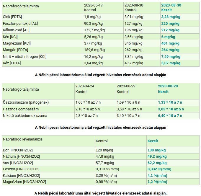 A kísérlet során a vetés előtt, a napraforgó és kukorica hibrid vetőmagok felszínére, 200 gr/ha Kiplant AWAKEN hasznos mikroorganizmusokat és indító tápanyagokat biostimulánsokat tartalmazó oltóanyag port vittünk föl. A magágyba 120 kg/ha Plantacote 30-7-7+2MgO+Te (2) tartamhatású, burkolt műtrágyát juttattunk alaptrágyaként. Talajmintákat vettünk vetés előtt, a termesztési ciklus közepén és végén a kezelt és a kontroll területekről és a növényekből melyeket mennyiségi és minőségi elemzésre küldtünk a Nébih pécsi mikrobiológiai és velencei talaj tápanyag laborjaiba. A lenti táblázatokban foglaltuk össze a főbb eredményeket: