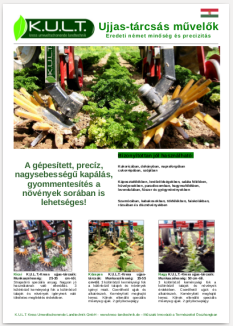 Ezúton szeretnénk bemutatni önöknek az általunk képviselt, németországi központú talajművelő gépeket, kultivátorokat gyártó K.U.L.T (Kress Umweltschonende Landtechnik GmbH) céget. A K.U.L.T. traktorhoz rögzíthető precíziós, nagy sebességű sor és soralj művelők, kultivátorok nagyon jól használhatóak a zöldség-, dísznövény- és gyümölcstermesztésben és a szántóföldi növénytermesztésben egyaránt, elsősorban a mechanikus és vegyszermentes gyomirtás területén. A K.U.L.T. legismertebb (szabadalmi oltalommal védett) terméke az úgynevezett “ujjas-tárcsás” művelő eszköz. Számos méretben és változatban rendelhető és legtöbb művelő gépünk egyik központi alkatrésze. A K.U.L.T termékei a precíziós gazdálkodáshoz a piacon elérhető eszközök legmagasabb technológiai és minőségi színvonalát képviselik. A kultivátorokat precíziós kamera, GPS RTK, rendszerekkel egészíthetőek ki, melyek biztosítják a művelőeszközök, kultivátorok automatikus soron-tartását.