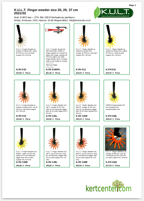 kult-fw-mini Published 2021/03/19 at 482 × 675 in K.U.L.T. ← Előző Következő → K.U.L.T Kis ujjas-tárcsák 25-37 cm átmérőig árlista Párban, kertészeti kultúrákhoz, szántóföldi növényekhez kultivátorozáshoz mechanikai gyommentesen tartáshoz, akár 24 sorban egyszerre, nagy sebességgel! Tetszik Betöltés...